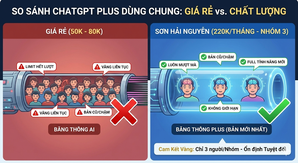 Tiêu chí Mua Chính Chủ (OpenAI) Mua Dùng Chung (Giá Rẻ) Mua Nhóm 3 (Sơn Hải Nguyễn) Giá tiền ~520.000đ 50.000đ 220.000đ Số người dùng 1 mình bạn 10 - 20 người 3 người Phiên bản AI Mới nhất Thường bị đẩy về bản cũ Luôn là bản Mới nhất Hỗ trợ Tự xoay sở Thường chậm trễ 24/7 qua Zalo