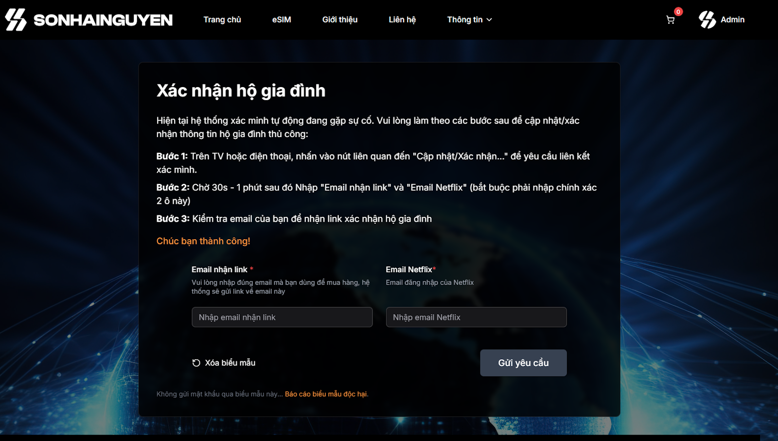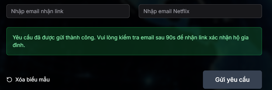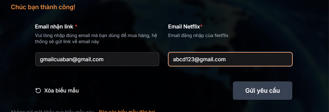 Nhập Email nhận link (email của bạn) và email tài khoản netflix được cấp cho bạn ví dụ abcd123@gmail.com . Ấn Gửi yêu cầu :